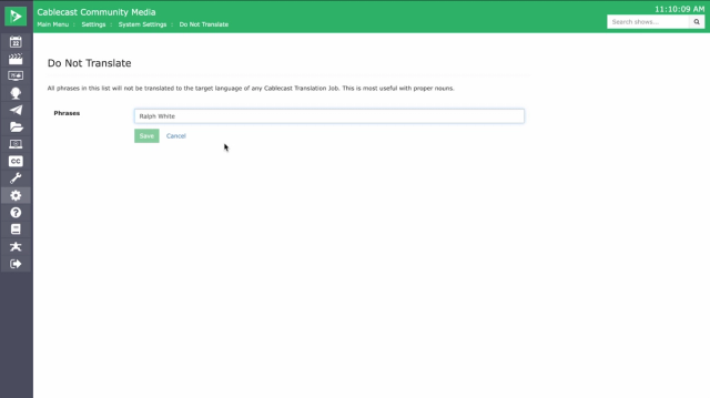 In the Do Not Translate section, this is where we would configure any words or phrases that we do not want to be translated by Cablecast. For example, if you have a city Council member whose name is Ralph White, but he doesn’t want his name translated to Ralph Blanco in Spanish. Once you enter your first word/phrase, be sure to press Enter to add it, then click Save to save your list of words/phrases.