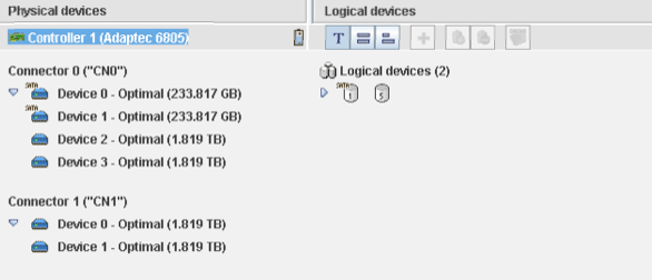 Once you have the controller selected, the drives that are installed in your server are visible under Physical devices.