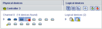 If a drive has failed and you have a degraded RAID set, you will see Warning and Error icons associated with a specific drive.