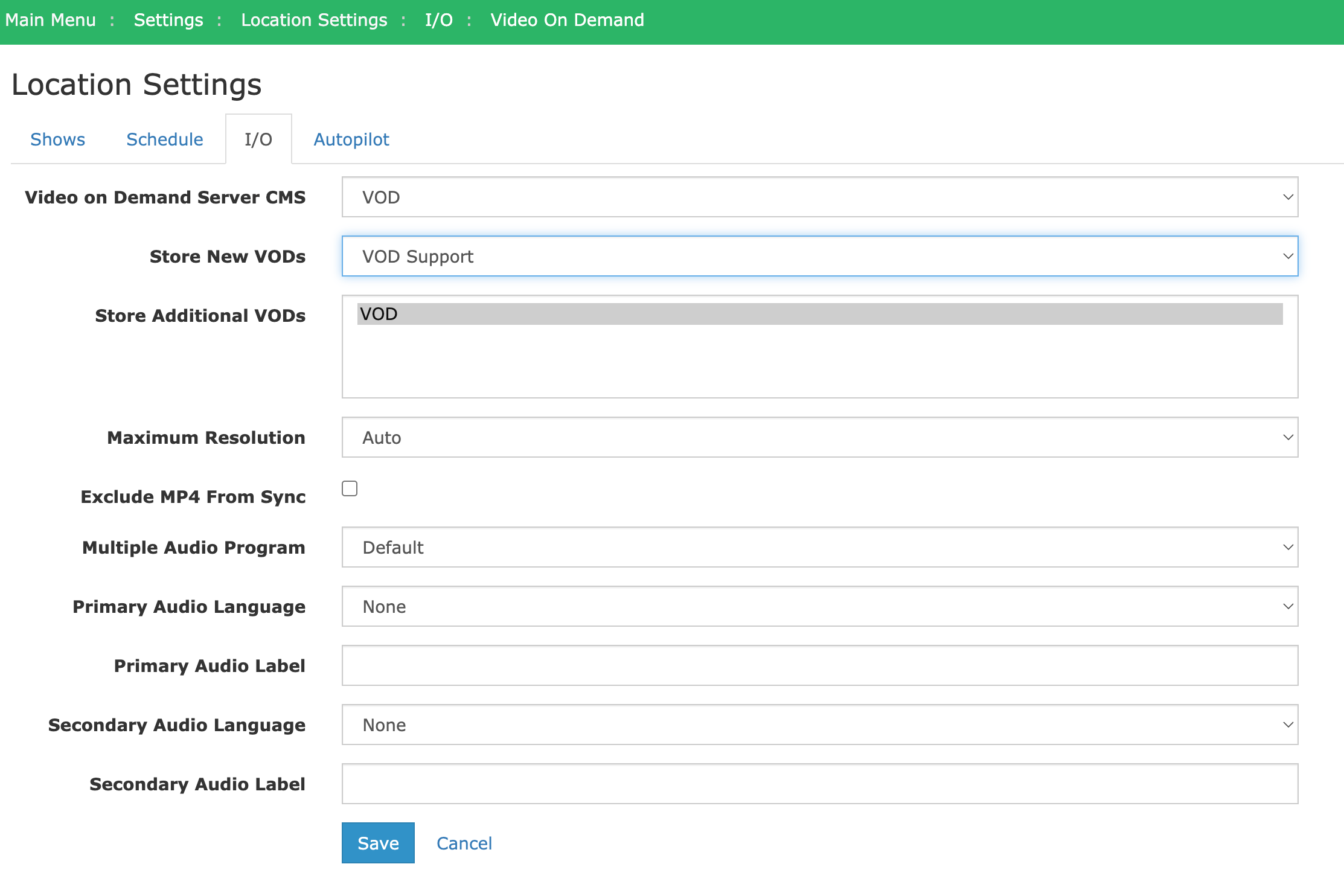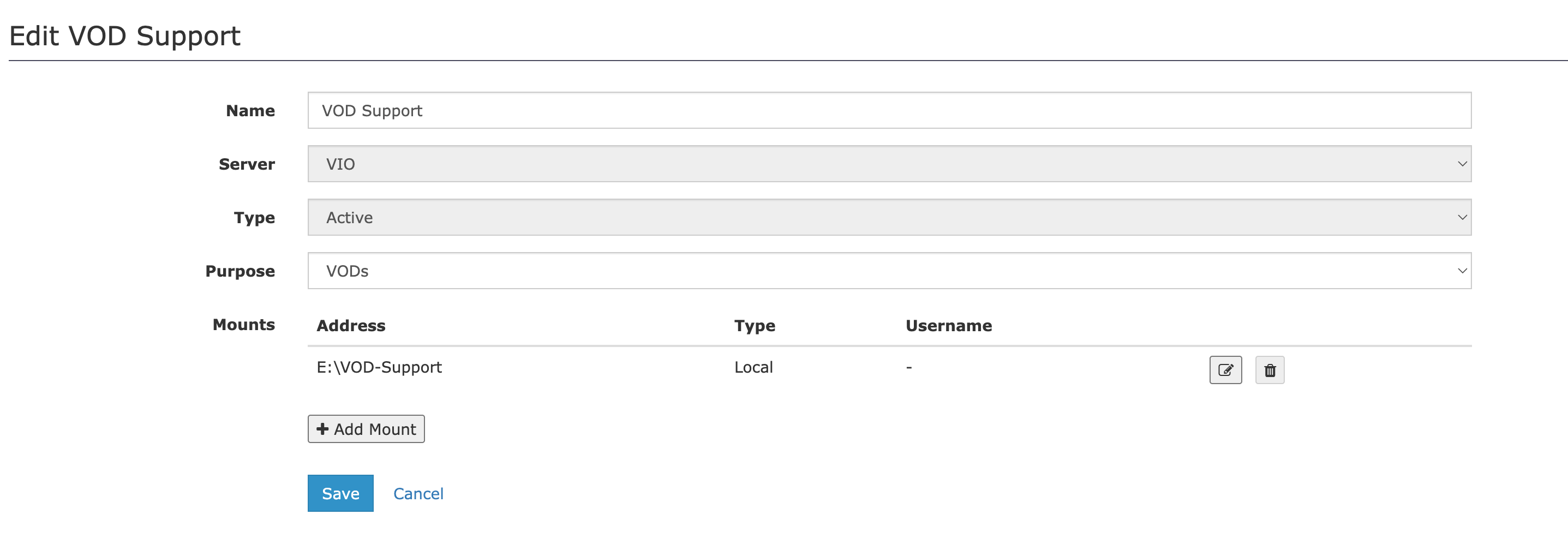 - Select the new file store (VOD Support) as the storage location for new VODs.