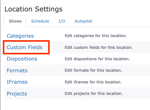 The Location Settings will open in the Shows tab. The second option will be Custom Fields, select that.