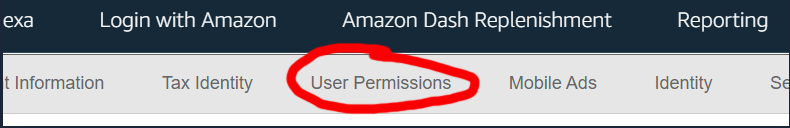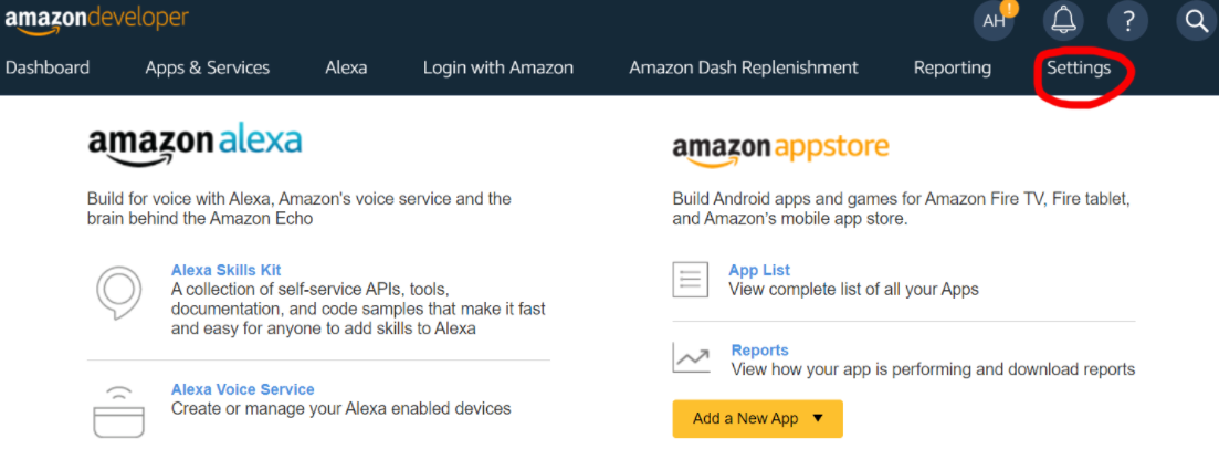 - Upon finishing account creation, you'll be sent to https://developer.amazon.com/dashboard - got to Settings as shown