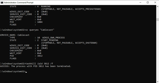 taskkill /pid {pid} /f- You should get the following command that it was successful