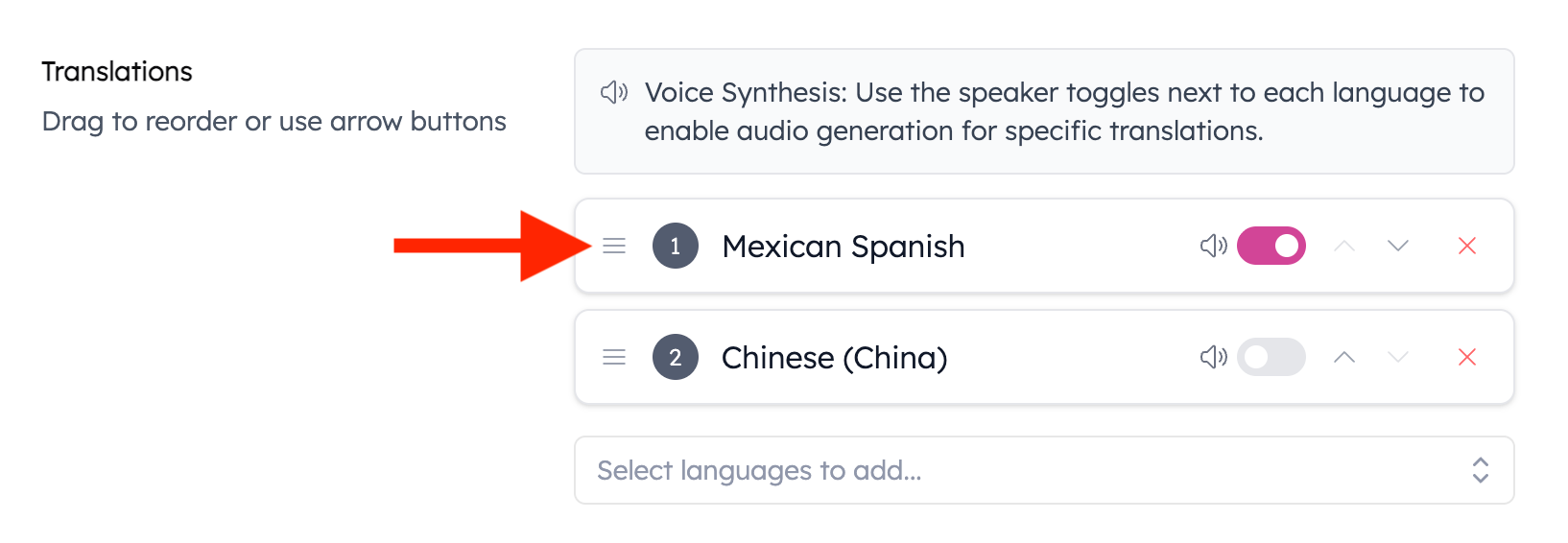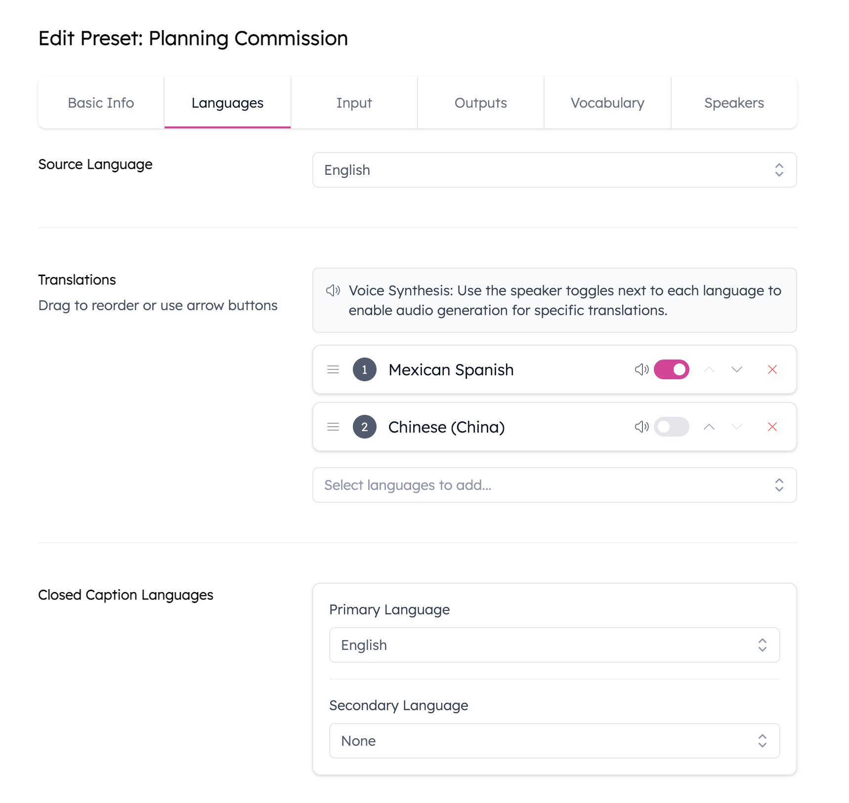 Click on the Languages tab. Select your source language. In the Translations section, you can choose up to 8 languages to translate captions to. If you click the speaker toggle to the right of the language, that will enable Voice on those languages.