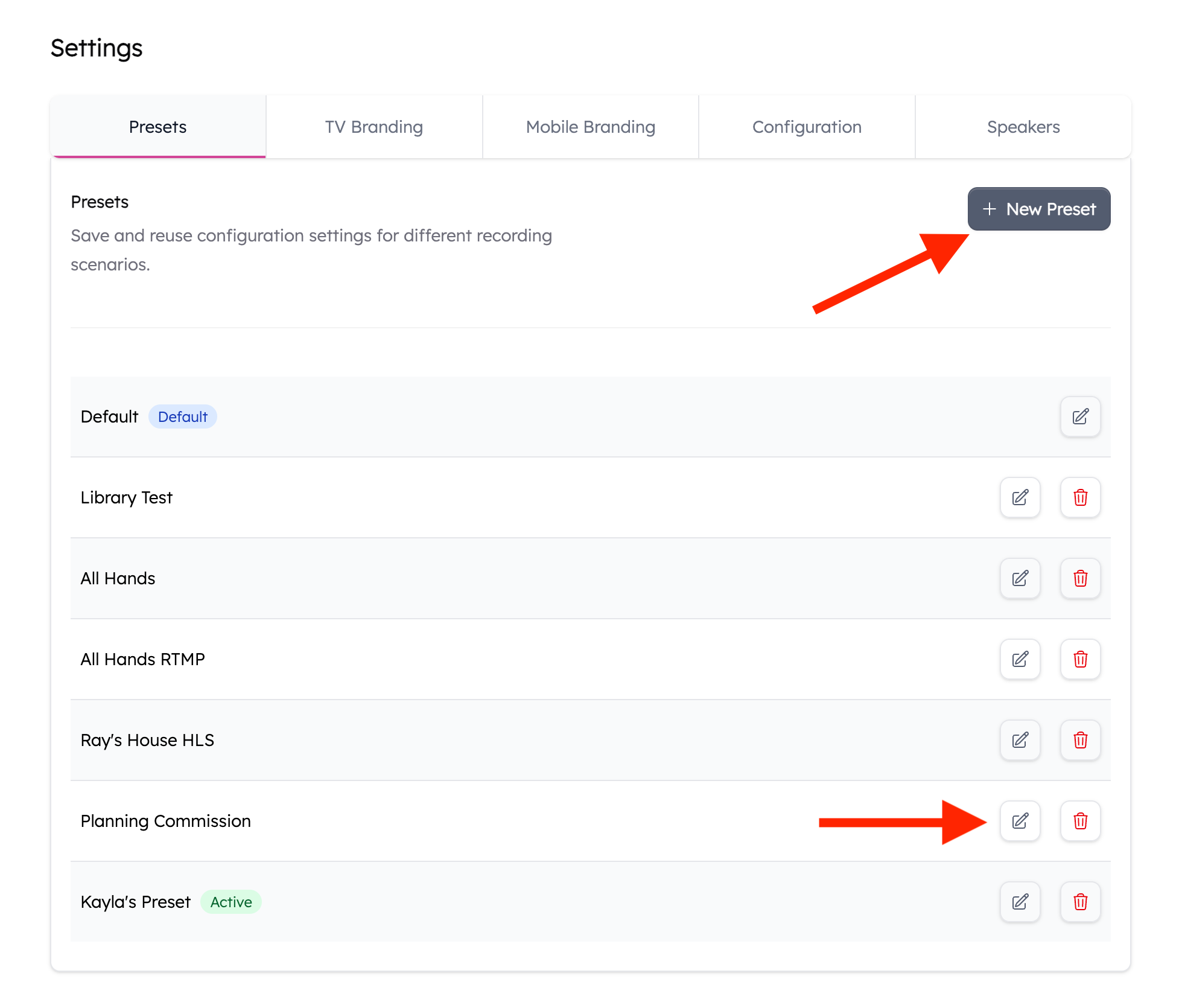 Edit the preset that you want to enable Voice on by clicking the pencil icon to the right of the preset name, or create a new preset to apply it to by clicking + New Preset at the top right of the Settings page.