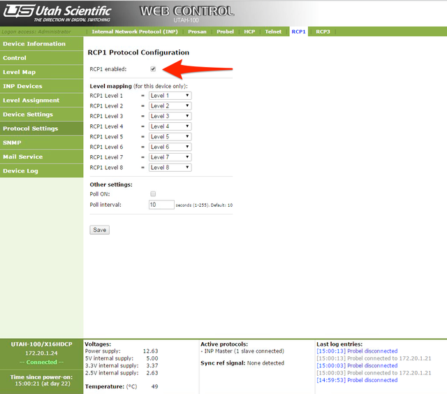 - Utah Scientific 100x routers controlled using the UtahScientificRCP1 Control Module