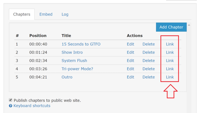You can get links to specific chapter marks for the public-site page. These links will bring users directly to that point in the video.