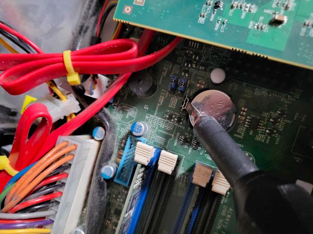 - Insert replacement CMOS battery or reinsert existing one for a forced reset. Insert at an angle then depress until latched.